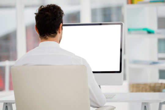 Transparent rear view businessman sitting on office chair focused