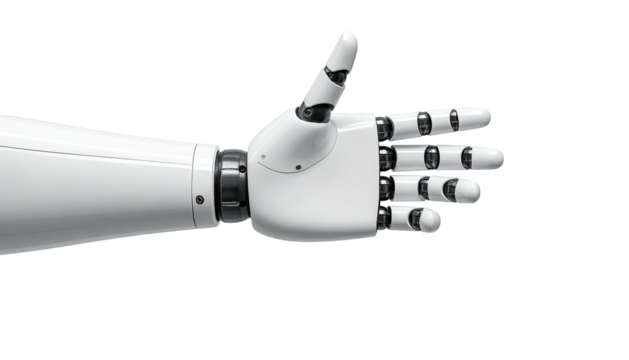 A robotic arm with a white, articulated hand gives a thumbs-up against a black background