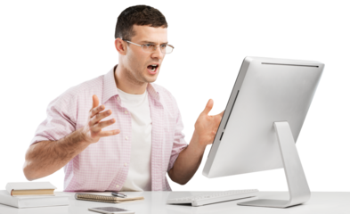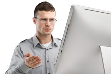 Young Caucasian man worker speak in glasses look at computer. Frustrated man with prolems