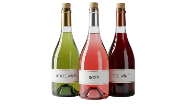 Elegant row of four diverse wine glasses showcasing rosé, rich red, crisp white, and deep crimson wines, perfect for connoisseurs and celebrations, isolated on transparent background.