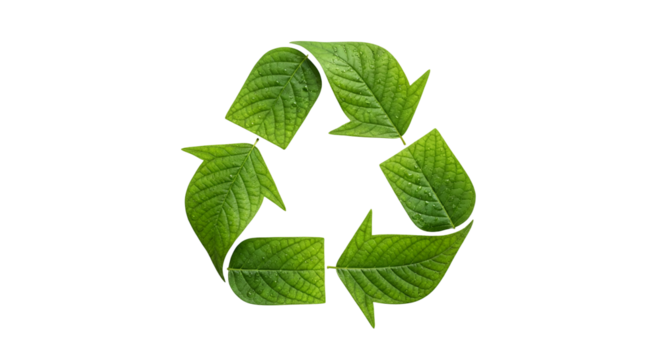 Three dimensional recycling symbol meticulously crafted entirely from vibrant green leaves symbolizing ecological conservation and sustainability on transparent background