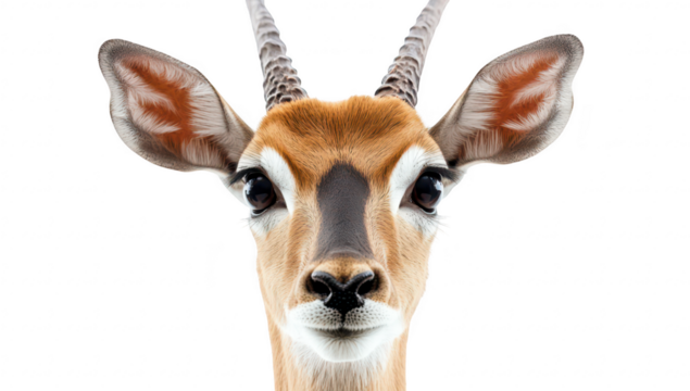 Close-up portrait of an antelope with striking facial features and expressive eyes. its natural beauty against a plain white background. ideal for wildlife photography