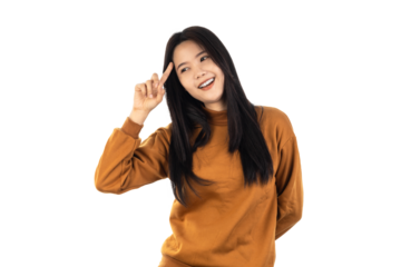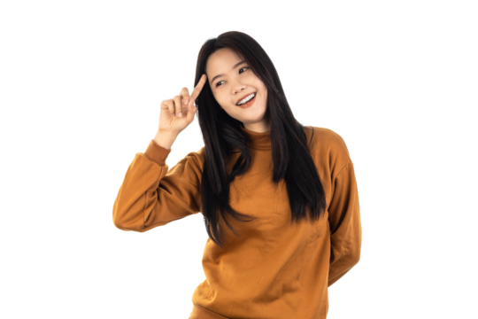 Asian young woman smiling and pointing to head with one finger, great idea or thought, good memory