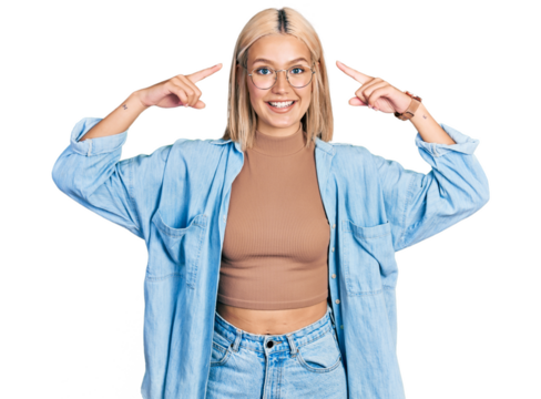 Young blonde girl wearing casual clothes smiling pointing to head with both hands finger, great idea or thought, good memory