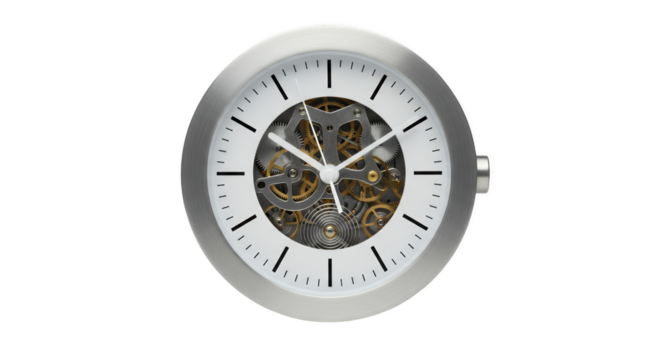 Precision Time: An elegant close-up reveals a modern clock's intricate mechanics, showcasing the art of timekeeping with detailed gears and precise hands.