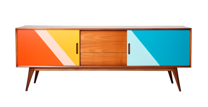 Modern mid-century furniture with vibrant colors. TV rack over isolated transparent background