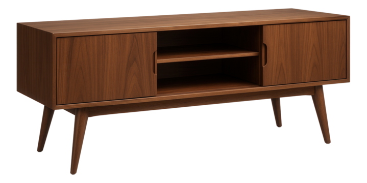 A mid-century modern TV console with splayed legs and walnut veneer, ideal for a retro-themed living area.