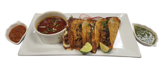 Delicious Birria tacos and consommé isolated on a transparent background.