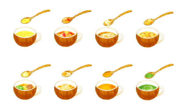 スープ&ポタージュ8種類セット 料理・食べ物の手描き水彩イラスト素材