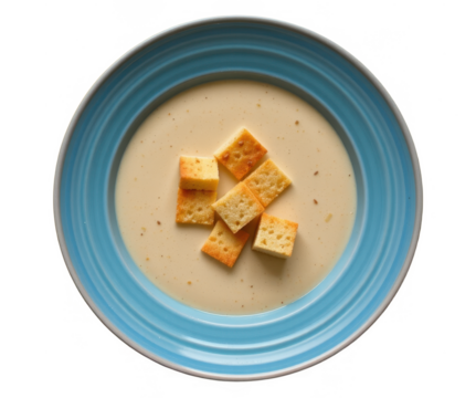 creamy soup bowl with croutons, simple top down view with negative space, pastel yellow background