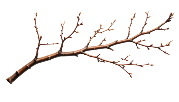 Detailed image of a bare tree branch, brown with tiny buds, set against a black backdrop