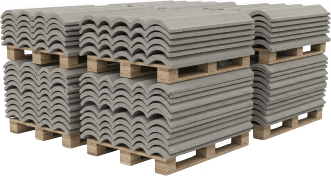 Stacks of grey concrete roof tiles with wavy edges are neatly arranged on wooden pallets ready for construction and building projects building materials stacked material exterior architecture