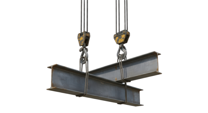 Industrial steel beams suspended by heavy duty crane hooks for construction and engineering projects isolated on transparent background