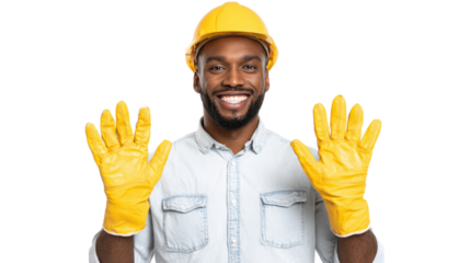 Smiling construction worker wearing yellow hard hat on transparent