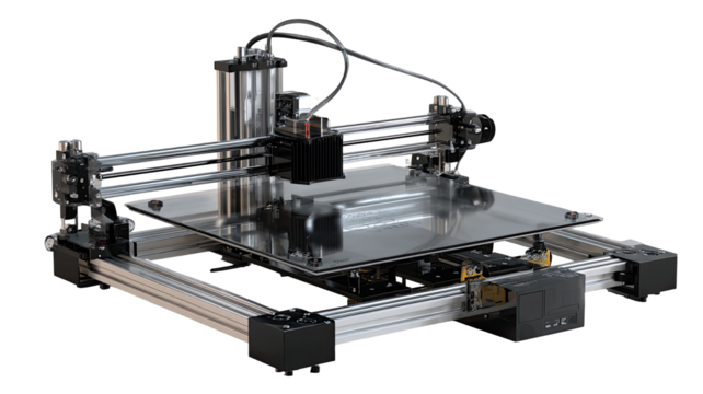 3D printer, metallic frame, glass build plate.  Precisely engineered machine for additive manufacturing.  High-tech components, intricate design