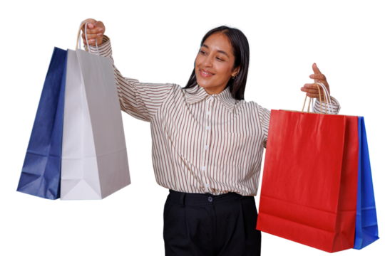 Woman enjoying shopping experience, holding colorful retail bags after buying gifts with a transparent background