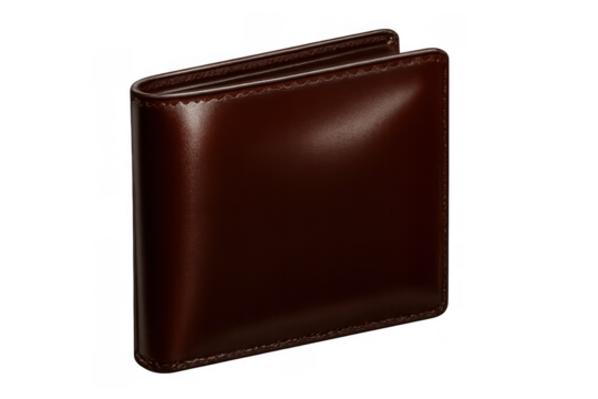 Brown leather bifold wallet with stitching, personal finance accessory for holding money and cards, transparent background
