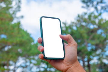 Man holding phone blank screen in the garden, outdoor. Phone mockup