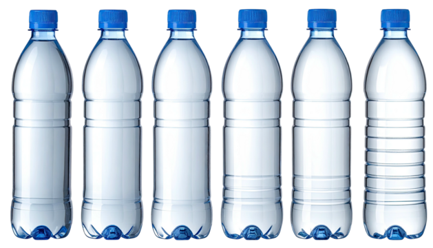 Six clear plastic water bottles in a row, all with blue lids
