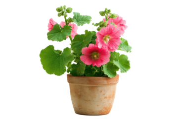 Pink hollyhock plant in terracotta pot on transparent background