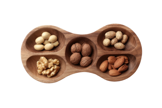 Wooden platter with assorted nuts.  Five sections hold various nuts  light-colored,  possibly macadamia or  similar;  walnuts;  almonds; and possibly  brazils or other dark-colored nuts