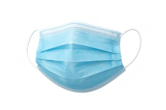 Close-up of a blue surgical mask isolated on white background symbolizing health and safety