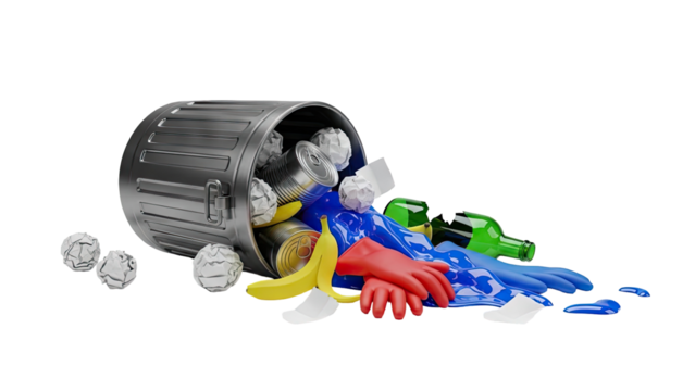 3D Overturned Trash Can Spilling Out Mixed Waste on transparent background