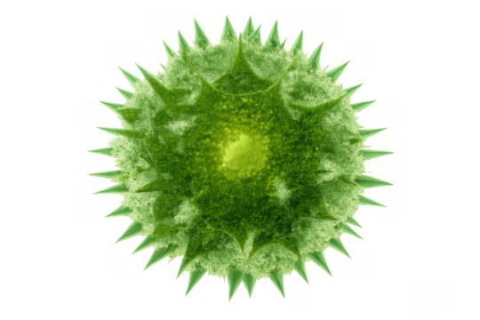 Microscopic green virus or bacteria cell with sharp spikes, representing infection, disease, and biology concept on transparent background