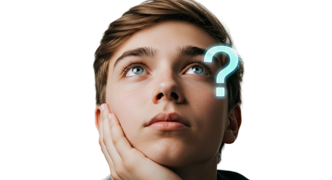 A graphic of an adult woman with long blonde hair, contemplating ideas and innovative products. The transparent background PNG.
