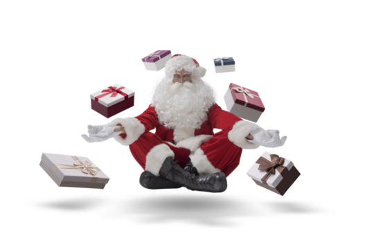 Woman in black meditating on scribble ball, arrows above head, cloud effects, isolated on white background. Concept of stress and mindfulness