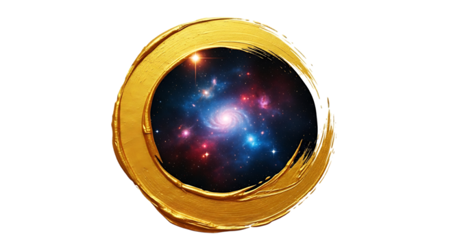 A captivating image showcasing a mesmerizing galaxy nestled within a golden circle, isolated on transparent background, evoking a sense of wonder and cosmic beauty, inviting viewers to contemplate the