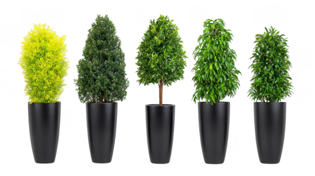 Five decorative potted plants with lush green foliage in modern black planters, isolated on transparency background, create fresh and vibrant indoor or outdoor atmosphere