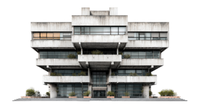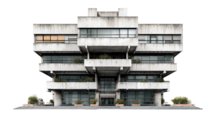 Modernist concrete building with geometric forms bold architecture raw material texture contemporary exterior structure on white background