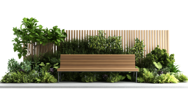 Urban greenery inviting bench surrounded by lush plants in a contemporary setting