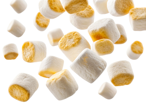 Fluffy toasted marshmallows falling in the air, perfect for confectionery advertising, sweet snack promotions, and food content creation representing indulgence and joy