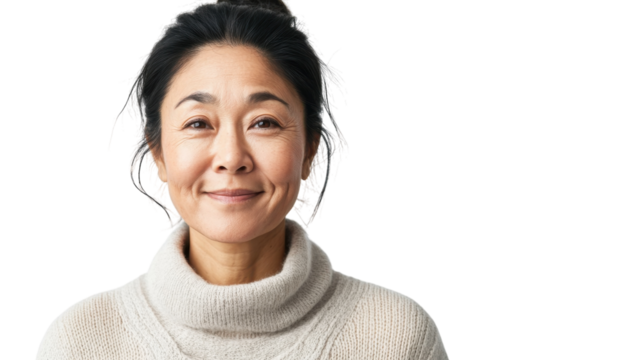 Smiling middle-aged woman in a cozy sweater with a warm expression in a bright setting