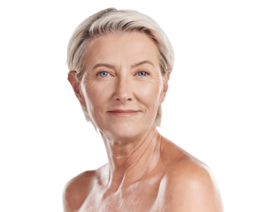 Portrait of a beautiful mature caucasian woman posing topless against pink background copyspace . Happy senior woman with glowing skin. Good skincare and a healthy routine is self care for your skin