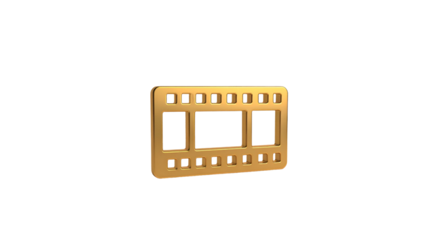Golden 3D rendering of a film strip icon, isolated on black, slightly tilted