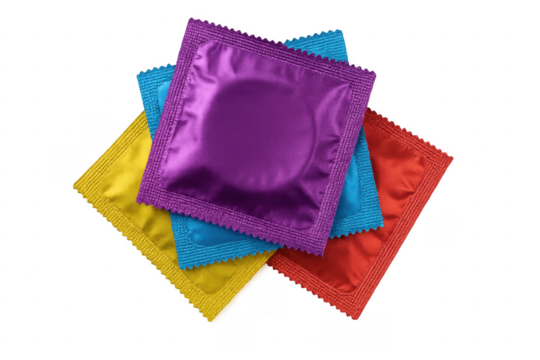 Four colorful condoms promoting safe sex and disease prevention, isolated on a transparent background