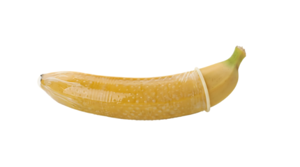 Close up of a yellow banana fruit covered with a textured dotted transparent condom for contraception and sexual health demonstration isolated on transparent background