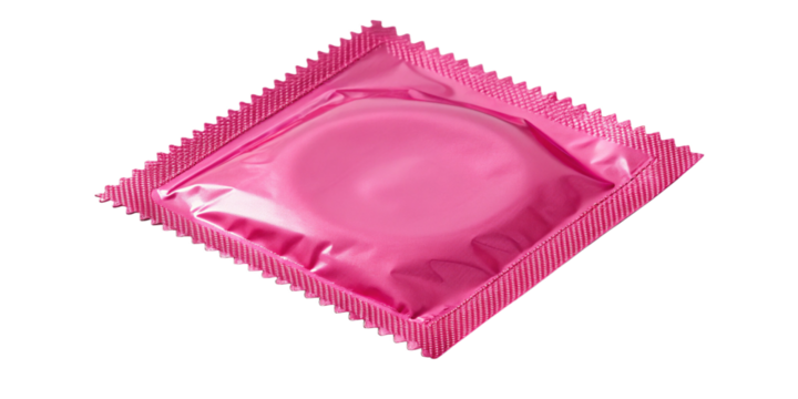 Pink Foil Condom Wrapper on White Background – Safe Sex and Sexual Health Awareness
