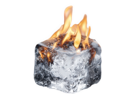 Ice cube with fire melting surreal isolated on transparency background creative contrast hot and cold conceptual object dramatic
