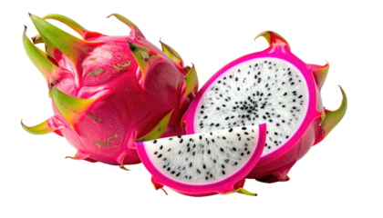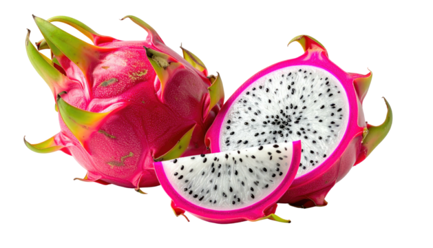 Two vibrant pink dragon fruit, one whole and one sliced, displayed against a black background.  The fruit's spiky exterior is contrasted by the white flesh speckled with black seeds within the slices