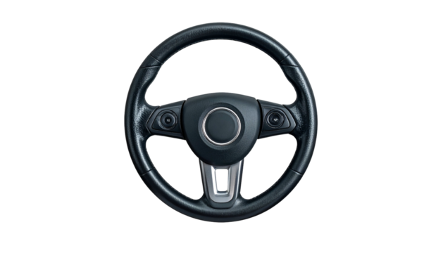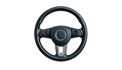 A close-up, centered, realistic rendering of a modern, dark-toned automotive steering wheel, set against a stark black background