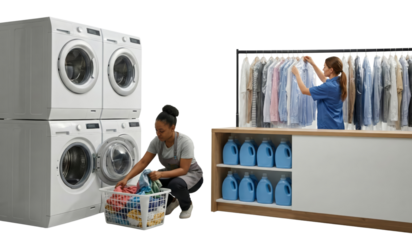 Indoor laundry and clothing store display featuring washing machines and hanging apparel with