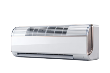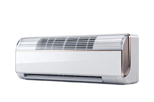 Modern wooden tv stand with a large flat screen television, isolated on transparent background