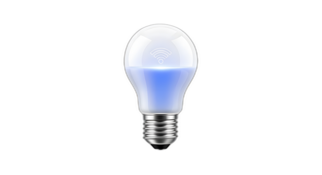 Modern, glowing smart LED light bulb featuring a prominent white Wi-Fi connectivity symbol in the center on transparent background