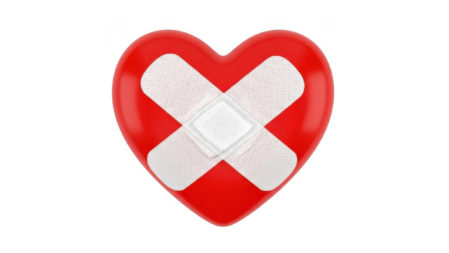 Heart made of shattered glass pieces reassembled, healing concept, isolated on a white background