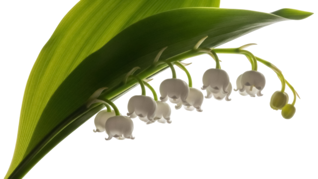 Lily of the valley isolated PNG on transparent background, delicate white flowers with green leaves for spring design