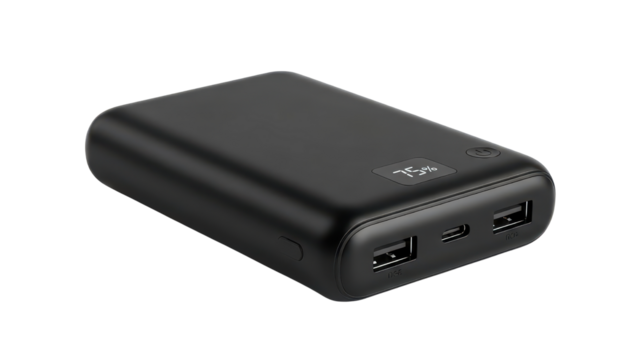Black Portable Power Bank with USB Ports and Digital Display isolated PNG with Transparent Background